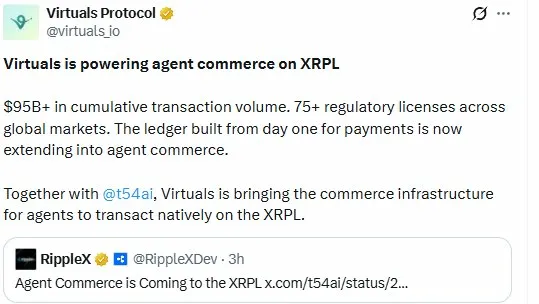 Virtuals Protocol noted in their post that the platform carries $95B+ in cumulative transaction volume and holds 75+ regulatory licenses across global markets — describing the XRPL as "the ledger built from day one for payments" now extending into agent commerce.