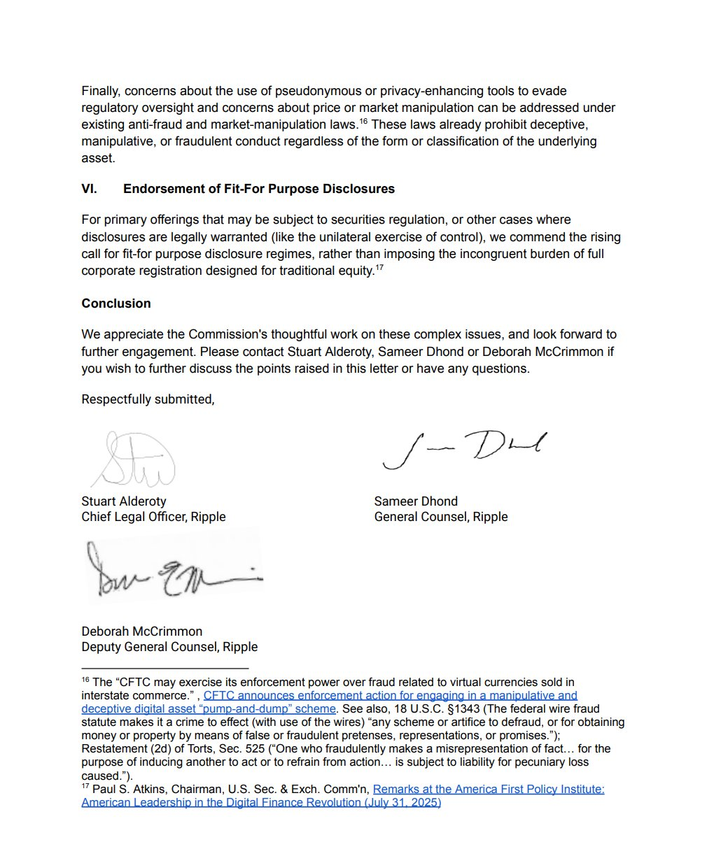 In the January 9, 2026 submission to the SEC Crypto Task Force, Chief Legal Officer Stuart Alderoty, General Counsel Sameer Dhond, and Deputy General Counsel Deborah McCrimmon outlined Ripple's position that regulators should move beyond the increasingly controversial "decentralization" test and instead focus on enforceable contractual rights and obligations to determine whether a digital asset falls under securities law.