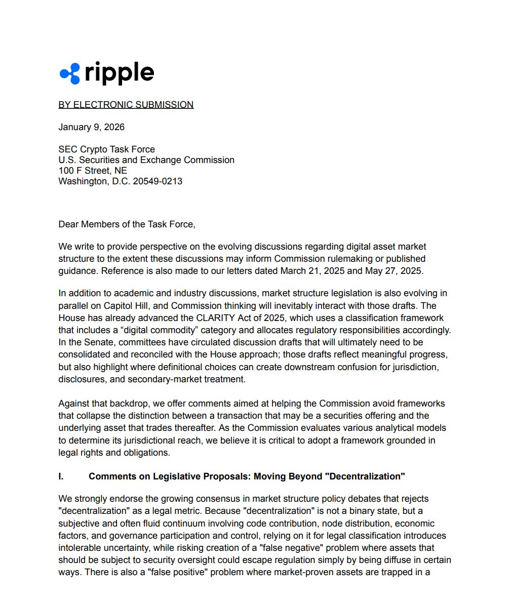 - SEC.gov - Ripple Letter to Crypto Task Force (January 9, 2026)